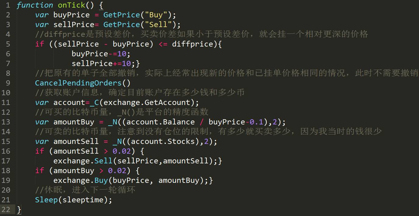 每个循环的主函数onTick(),这里定的循环时间3.5s,每次循环都会把原来的单子撤销,重新挂单,越简单越不会遇到bug。