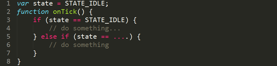 而市面上大多数交易框架,都是采用回调模式的机制,也就是500毫秒最多只有一个Tick,这还是理想状态。真实情况下onBar/onTick,Tick不漏掉就不错了。为什么呢?因为onBar/onTick函数里面,你要处理一整遍代码逻辑,很浪费时间,不管你愿不愿意,你的策略逻辑必须被打断,必须采用状态机的模式,比如: