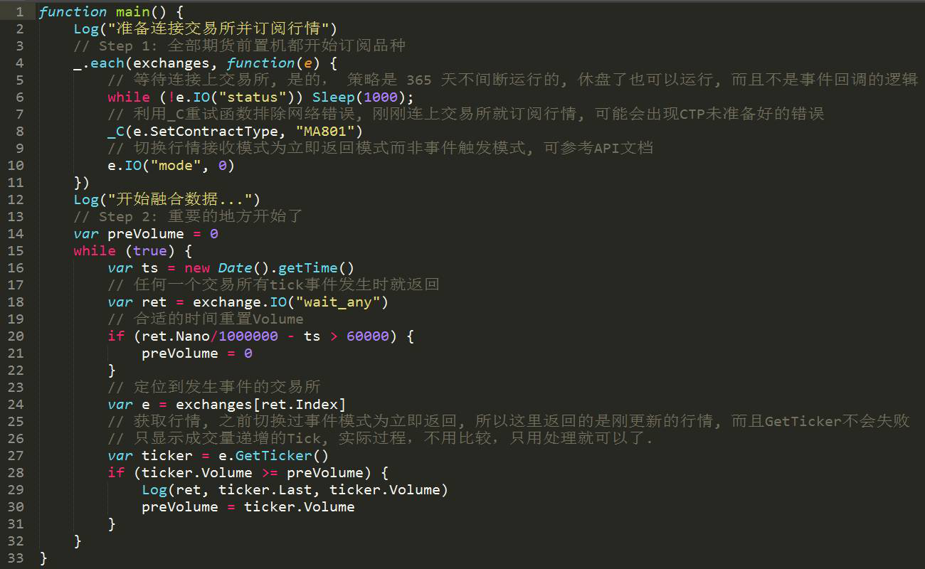 粉丝varts=newDate().getTime() varret=exchange.IO("wait_any") if(ret.Nane/1000000-ts>60000){ preVolume=0 } vare=exhcanges[ret.Index] varticker=e.GetTicker() if(ticker.Volume>=preVolume){ Log(ret,ticker.Last,ticker.Volume) preVolume=ticker.Volume } } }