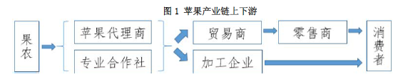 我国苹果产业链较短,根据消费形式分成了以贸易商为主和以加工企业为主的两条支链(如图1所示),其中鲜果消费为我国苹果消费的主要形式,主要通过各级贸易商对收购的苹果进行分拣、筛选、包装等初级加工后直接提供给消费者实现。加工消费主要通过加工企业将收购的苹果制成果脯、苹果脆片、苹果醋、苹果酒等深加工产品提供给消费者实现。