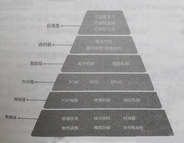 区块链技术模型自下而上包括数据层、网络层、共识层、激励层、合约层和应用层。每一层分别具备一项核心功能,不同层级之间相互配合,共同构建一个去中心化的价值传输体系。