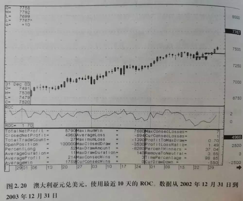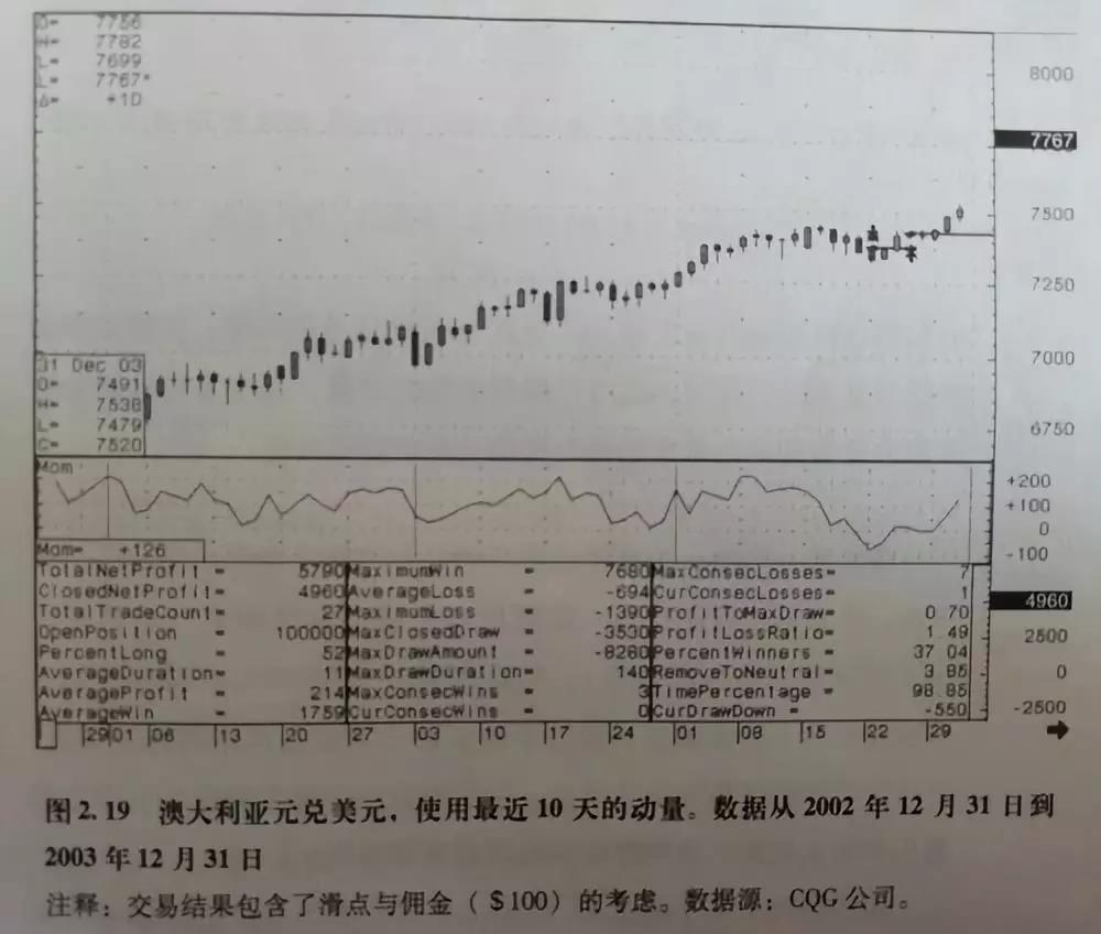 所以,这些摆动指标非常适用于作为止损转向的趋势跟随系统,可以利用零线与指标值之间的关系来确定空头和多头信号。我们将图2.19与图2.20进行比较不难看出这些指标的结果是相同的。换句话说,如果我们同时使用这两种指标,并不能够达到量化投资与程序化交易投资者分散化交易的目的。