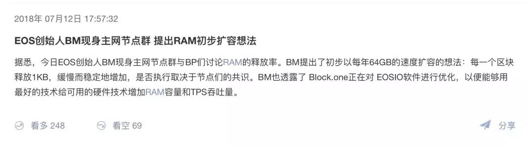 说回RAM扩容的方案:每出一个区块RAM增大1KB,即便是缓和的扩容方案,RAM的价格也出现了剧烈的波动,但这是一个很好的“去泡沫”的过程。既然RAM扩容方案迟早要推出,那么越早推出,就能越早稳定RAM的价格,对EOS生态稳定发展也越有利。