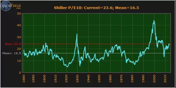 有人说美国股市历史上熊市平均市盈率为7倍,正常时候为约14倍,而牛市顶峰的时候平均市盈率为21到25倍之间。Robert Shiller在2013年针对标普500指数计算市盈率的方法:【cpi调整,10年平滑历史平均值16.5x,目前是23.6x,进入到历史高位区域,历史最低5x附近。上一轮股市扩张周期2002-2007,市盈率从21.3x扩张到26.7x,扩大25%;标普从768.63上涨到1576.09,涨幅105%中市盈率expansion带来的影响偏小;本轮股市扩张周期2009-2013,市盈率从13.3x扩张到24.3x,扩大83%;标普从666.79上涨到前期高点1729.86,涨幅159%中市盈率expansion带来的影响占比很大】。