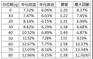 在组合构建时,选择因子大于q分位数的contango商品进入short列表,选择小于100-q分位数的backward商品进入long列表。q取不同值的测试结果见表2。