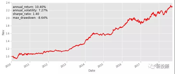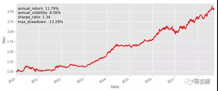 回溯TS组合,历史累计净值及其风险收益指标见图3。可以看到,该组合近8年表现非常优秀,年华收益11.52%,夏普高达1.53[4];风险方面,最大回撤8.19%,年华波动7.28%,属于中等风险水平;另外,该组合并非每年稳定盈利,具有一定的周期性。