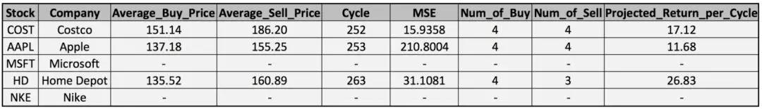 当然,这种方法可以应用于尽可能多的股票。 我们列出了Costco,Apple,Microsoft,Home Depot和Nike的平均购买价格,平均销售价格,周期长度,样本均方误差,购买数量,销售数量和每个周期内的预计回报。