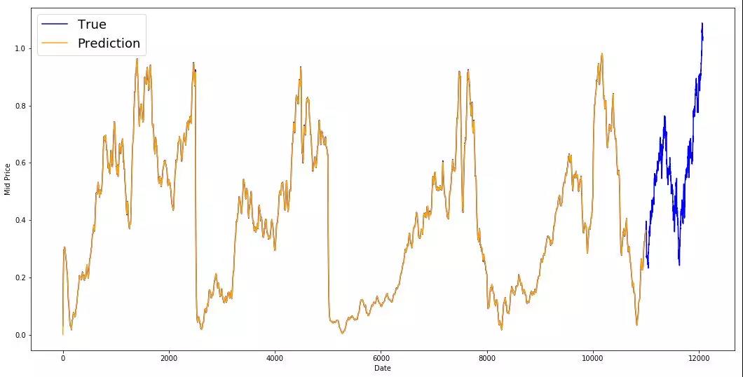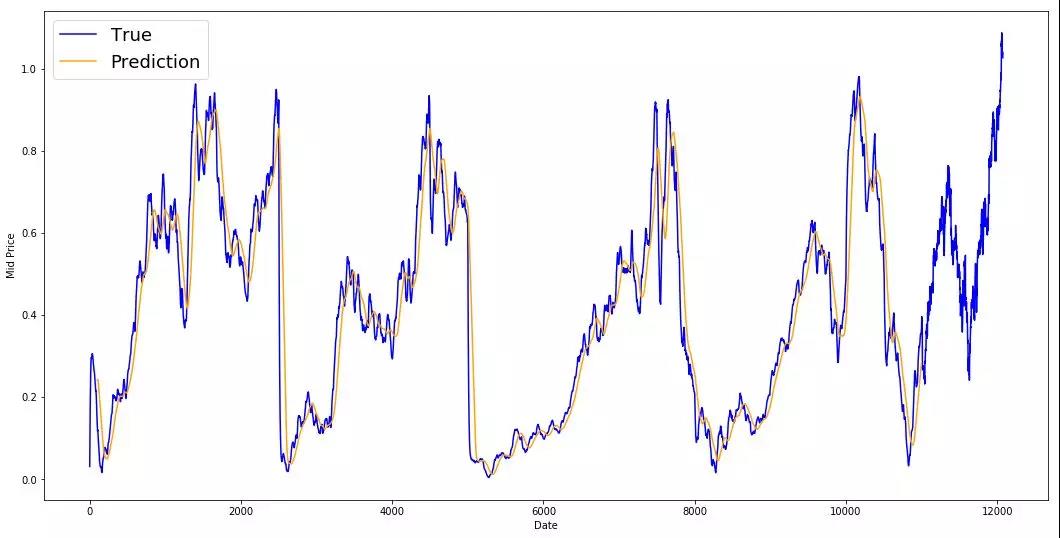 尽管LSTM并不完美,但它似乎在大多数情况下都能正确预测股价走势。请注意,你的预测大致在0和1之间(也就是说,不是真实的股票价格)。这是可以的,因为你预测的是股价的走势,而不是股价本身。