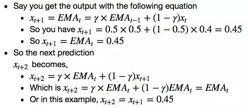 上面的图(和MSE)说明了什么呢?对于非常短的predictiosn(一天之后)来说,这个模型似乎不算太坏。考虑到股票价格在一夜之间不会从0变化到100,这种行为是明智的。接下来我们来看一种更有趣的平均技术,称为指数移动平均。