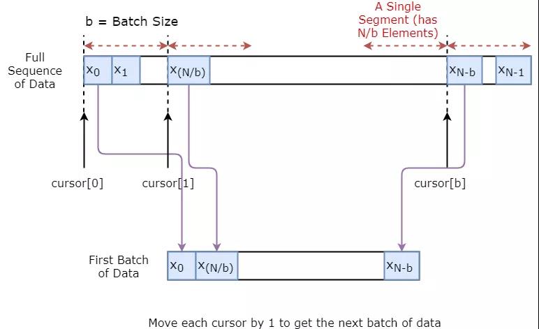 下面将演示如何可视化创建一批数据。基本思想是将数据序列划分为N / b段,使每个段的大小为b,然后定义游标每段为1。然后对单个数据进行抽样,我们得到一个输入(当前段游标索引)和一个真实预测(在[当前段游标+1,当前段游标+5]之间随机抽样)。请注意,我们并不总是得到输入旁边的值,就像它的预测一样。这是一个减少过拟合的步骤。在每次抽样结束时,我们将光标增加1。