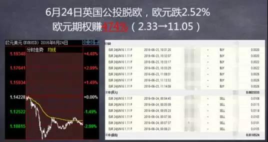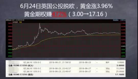 6⽉24号,英国脱欧公投这次,这⼀仗打得很漂亮。脱欧那天是周五,周⼆时录了个视频,告诉⼤家该如何把握这次机会,讲的很细,选择什么合约,怎么布局,等等。周四的时候也在新浪财经做了⼀次直播,也是跟⼤家说明怎么把握这次机会。