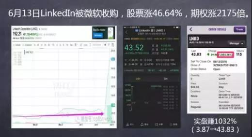 外盘是全球市场,更有效,⼀旦某些财经事件发⽣,很快就会 price in 其影响,市场往往短期就出现较⼤波动,从⽽出现⼀些⾼确定的期权交易机会。2016年上半年时,⼀位 IT ⾏业的朋友跟我讨论微软会收购谁,他认为有可能是LinkedIn,也有可能是另⼀家公司。我当时建议,如果你觉得有可能是LinkedIn 的话,就可以埋伏⼀些它的远期 call 啊,仓位按照你能接受的损失来下就好。朋友听了我的建议,默默买了⼀些call。6⽉13号,微软宣布收购LinkedIn。LinkedIn 正股涨了46.64%,涨幅最⼤的 call 当天涨了2000 多倍。我朋友因为埋伏了⼀段时间,有⼀些时间损耗,但也赚了10 倍,他⾮常开⼼。我⾃⼰是⾮常可惜啊,⾃⼰没买,错失了⼀个实现⼩⽬标的机会。