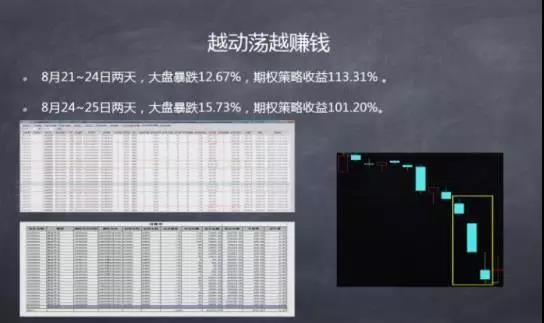 因为当时对⼈⺠币汇率研究较多,我认为⼈⺠币贬值应该会带来资⾦外流,从⽽对股市产⽣冲击,所以做多波动率的时候,在 Delta 这块配了⽐较多的 put,结果没想到后⾯ 24-26 号⼤盘都是暴跌,⽽且期权的收益率会那么惊⼈,两个⾃营账户都是两个交易⽇整体净值翻番,⽽且,当时的保证⾦仓位只有 20%-30%,仓位并不⾼。后来,波动率平静下来后,我⼜卖了⼀阵波动率。此处暂按不表。