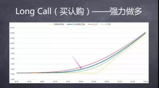 期权有三要素:到期⽇、⾏权价和⽅向(call or put)。跟股票、期货的 payoff 图不同,期权的 payoff图则多数是曲线形的。因为,虽然期权的到期损益也是直线型的,但由于实际交易中投资者⼀般不会持有到期,多数都做盘中损益,所以期权交易的盘中损益图⼀般是曲线型的,这点,很有意思也很奇妙。