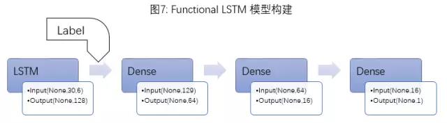 除了传统的Sequential Model(一输入,一输出)外,本推文还尝试构建了Functional Model(支持多输入,多输出)。前面提到的features处理方法丢失了一项重要的信息:价格的高低。相同的input处在3000点和6000点时的future_return_5可能有很大不同。因此,本文尝试构建了"二输入一输出"的Functional Model:标准化后的features作为input输入LSTM,LSTM层的输出结果和一个指标-label(label=np.round(close/500))作为input输入后面的Dense层,最终输出仍为future_return_5(图7)。