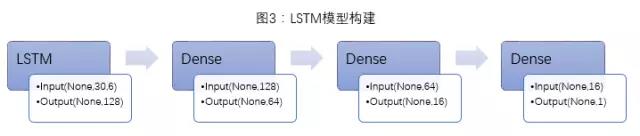 模型构建:鉴于数据较少(训练数据约2500个,预测数据约500个),因此模型构建的相对简单。模型共四层,为一层LSTM层+三层Dense层(图3)。