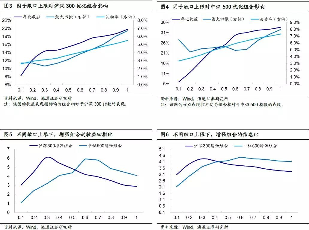 在敞口上限较低时,沪深300指数优化组合的实际敞口已远低于敞口上限,因此增加上限对沪深300指数优化组合收益的影响相对较小。而在一个相对较大的敞口上限区间内,增加上限时,中证500指数优化组合的实际敞口增幅大,因此增加上限对中证500指数优化组合收益的影响相对较大。