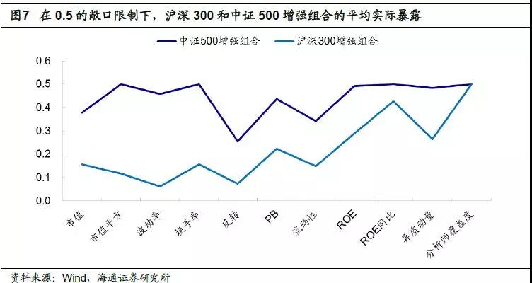 对比沪深300指数和中证500指数的行业分布可发现,前者相对较为集中,银行和非银金融行业市值占比33%(以2018年7月底的数据为例),但这两个行业的个股数仅有86个,占比2.43%。换言之,对于沪深300增强组合,需在2.4%的股票中选出市值占比33%的股票,行业中性对组合的约束性大。为满足行业中性的限制,沪深300增强组合在很多因子上的敞口都未达到上限。