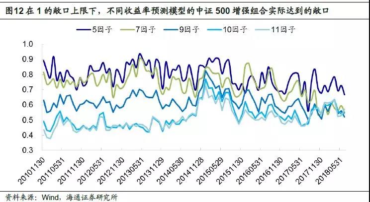因子体系在不断完善,因此有效的敞口确定方法须适应变动的收益率预测模型。常用的收益率预测模型通常包含9个因子:市值、非线性市值、换手率、反转、波动率、估值、流动性、ROE及ROE增长。本节考察在这种常用的因子体系下,按照上述方法动态确定敞口上限是否仍然合适。
