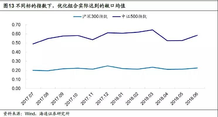 以设定2018年7月底的敞口上限为例,我们先预先设定一个相对较大的敞口上限如1,然后考察在此上限下,前1年(即2017.07-2018.06)优化组合在各个因子上的实际暴露均值(下图)。结果显示,组合实际达到的敞口随时间变动小,且中证500指数实际达到的敞口均高于沪深300指数,与前文的最优参数特征一致。将这1年间的实际敞口等权平均,即为2018年7月应设定的敞口上限。
