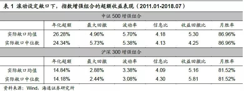 下表展示了按照如上滚动确定敞口上限方法获得的增强组合,相对于基准指数的超额收益表现。其中,“前期敞口均值”是指,最新一期的敞口上限是前1年实际敞口的均值;“前期敞口中位数”是指,最新一期的敞口上限是前1年实际敞口中位数。整体来看,无论是按照前期敞口均值还是中位数来确定敞口上限,最终得到的优化组合表现均不会太差,虽然收益风险比略低于前文中的最优参数,但在0.1-1之间10档敞口上限中,排名靠前,在前3左右。