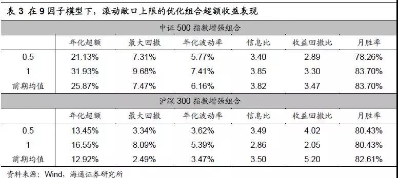 需要提及的一点是,本文提出滚动确定上限方法的目的并非在于得到最优的模型收益表现,而是提出一个适用面相对较广的敞口上限确定方法。从一个最直观的例子来看,对于中证500增强组合,在9因子模型下,敞口上限设为1的组合收益风险比更高;而沪深300指数增强组合则是在敞口上限为0.5时,收益表现更优。按照固定的敞口上限设置并不能满足不同标的增强组合的构建。而滚动确定敞口上限的方法灵活性相对更高,因此在不同模型体系下都能获得相对较优的收益表现。