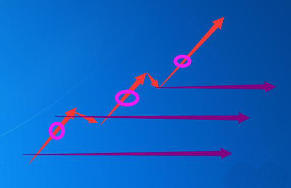 图中,圈是你开仓和加仓的未知,紫色线是你不停太高的止损线。这种方式可以较好的实现你的思路,因为你承担的风险一直有限,而且有行情的时候你的仓位可以加满。