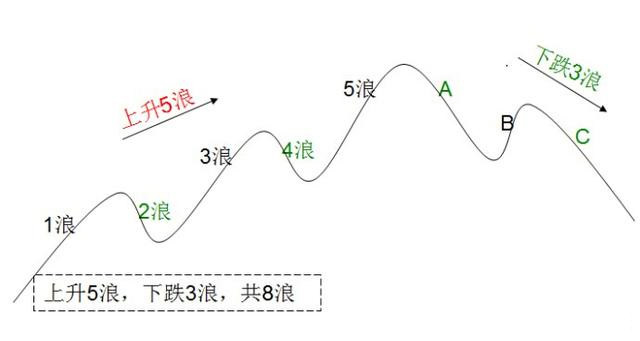 分为1、2、3、4、5、a、b、c共八个浪。1、3、5、b为上升浪。其中以3浪幅度最为大,因此又称主升浪。2、4、a、c为下跌浪也叫回调浪。其中以3浪最为凶险,因此又称主跌浪。八浪结构是永远不变的,不管趋势规模的大小。