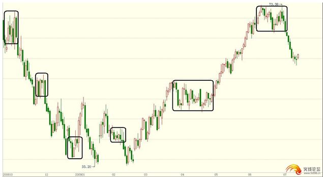 贴图如下,这是原油,所有的金融市场都一样,外汇股票期货债券理念没区别。黑框框是震荡,其他都是趋势行情,我们都是死在这些框里的。很多系统都是上图来详细说明什么进场出场点,都是马后炮,换个图全死。大家先问问自己,我的系统能在图里明显趋势的地方赚钱么?如果不确定,复盘!随便拿手边什么图,先圈震荡,然后看忽略震荡后,单边能不能赚,能赚所有行情的%多少?