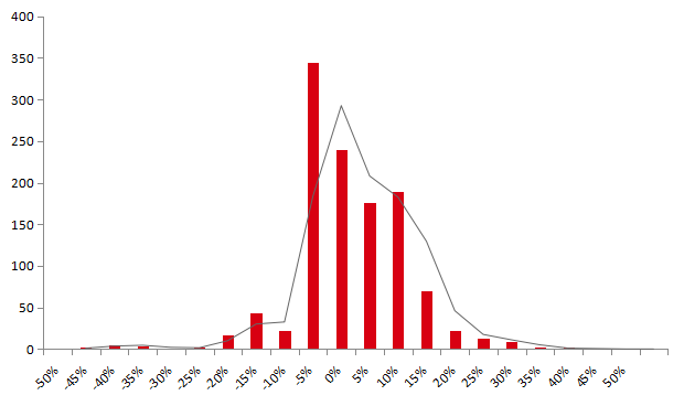 今年CTA累计收益主要分布在-30%至45%,这一收益分布占了整个分布的81%左右。此外,分布的平均数是3.4%,中位数是4.0%,四分之一分位数是17.3%,意味着今年CTA策略的产品收益率能达到4%以上,基本就能超越同类平均水平,能达到10%以上的就已经是佼佼者,而收益率达到18%的以上基本就是市场的前25%。