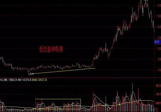 在股价经过长时间的下跌,或者快速大幅的下跌,之后走出了窄幅震荡的走势,成交量也极度的萎缩,而如果后面还是维持这种弱势的震荡,但是发现底部正在一点点的抬高,那么很可能就是庄家在吸筹。震荡是为了让我们投资者抛出手中的**,而底部的逐步抬高正式庄家吸筹最好的证据。
