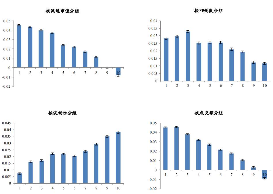 根据个股的一些指标进行分组,考察不同指标值区间反转策略的收益率。我们分析的指标包括:流通市值排序、PE 倒数排序、最近两个月的波动性排序最近一个月成交金额排序。这些指标不同分组中反转策略的收益如下面图中所示,横坐标为按指标从小到大分组的组别,纵坐标为反转策略的平均收益(个股超越基准指数的收益,平均持有期为 35 天)。可以看出,市值小、波动性高、成交金额低和 PE 高的个股中反转策略比市值大、波动性低、成交金额高和 PE 低的个股有效,而且这种关系比较明显。