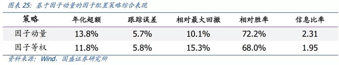 我们设计了基于因子动量的因子配置策略。从回测结果来看,相比于因子等权配置,基于因子动量的因子配置策略充分利用因子的混合动量效应,在不提高组合跟踪误差的情况下,明显地提高了组合的年化超额收益、相对胜率和信息比率,同时大幅降低了组合回撤的风险。