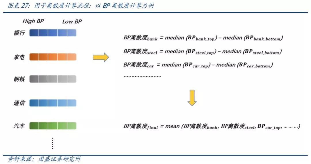 我们根据某一个因子在行业内对个股进行分组,计算每个行业内多空两端的因子原始值差异,最后将所有行业的因子差异进行算术平均,得到最终的因子离散度。由于不同因子的量纲不完全可比,我们以过去72个月的数据对因子离散度进行标准化,标准化后的因子离散度具有横向可比性。