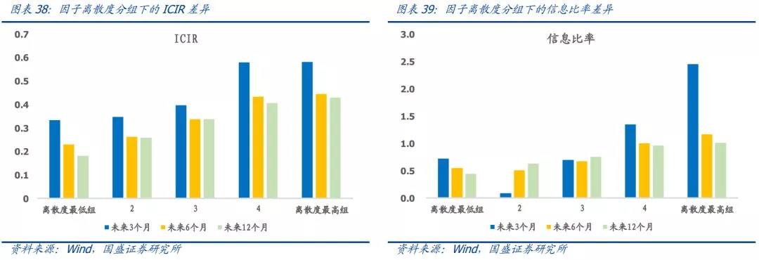 从横截面维度来看,我们每个月按照因子离散度将因子分为五组,以此来观察因子离散度的横截面选因子能力。总的来说,高离散度的因子未来具备更好的收益区分能力同时也能带来更高的组合信息比率。