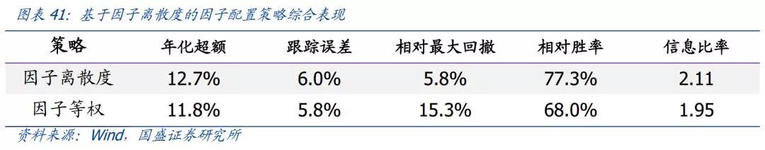 从回测结果来看,基于因子离散度的因子配置策略的年化超额收益为12.7%,相对最大回撤仅为5.8%,相对胜率为77.3%,信息比率为2.11。相比于因子等权方案,因子离散度配置方案大幅降低了组合的最大回撤,提高了组合的相对胜率。