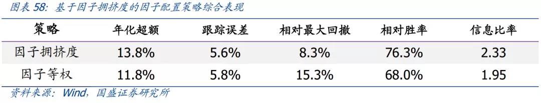 从回测结果来看,基于因子拥挤度的因子配置策略的年化超额收益为13.8%,相对最大回撤仅为8.3%,相对胜率为76.3%,信息比率为2.33。与因子等权配置相比,基于因子拥挤度的配置策略既提高了组合收益,也降低了组合回撤风险,同时还大幅提高了组合的胜率。