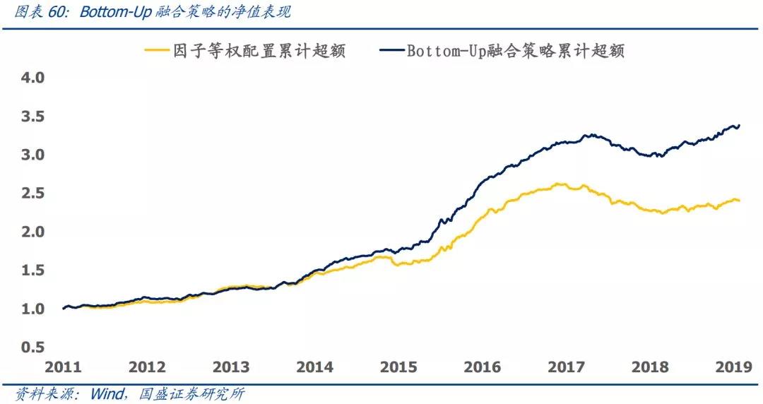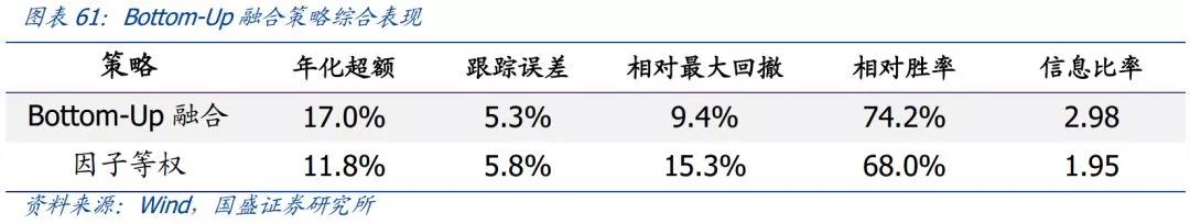 基于因子动量、因子离散度和因子拥挤度,我们可以分别得到三种大类因子配置的权重,Bottom-Up融合策略的最终权重定义为这三种配置方案的算术平均。从策略表现来看,Bottom-Up融合策略相比于因子等权策略,无论在收益、回撤、胜率和信息比率上均有大幅的提升。