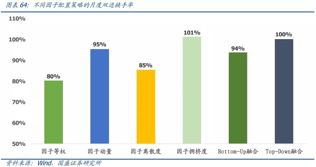 因子择时的必然结果是策略换手率的提升,出于交易成本的考虑,我们测算了前面每一个因子配置策略的换手率。从结果来看,基于三个指标或者三个指标的融合进行因子配置并没有显著提高组合的换手率。