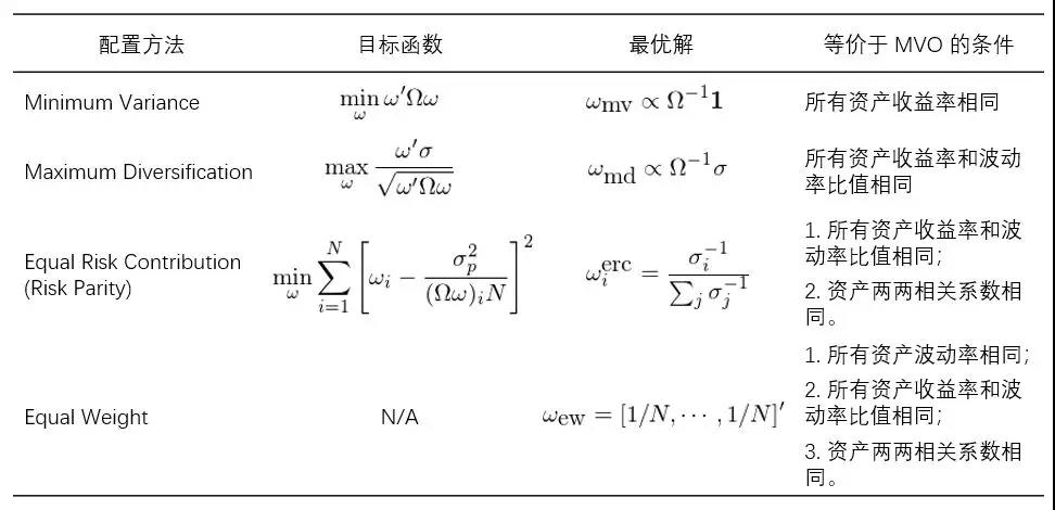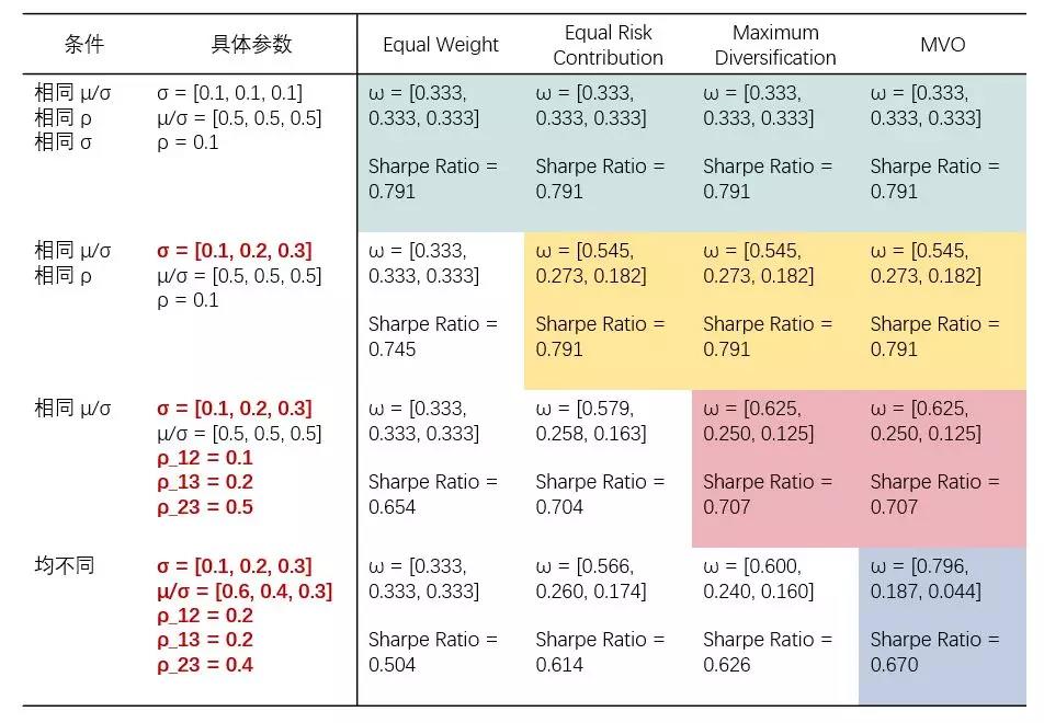 在实际资产配置中,由于 μ_i、σ_i、ρ_ij 中的一个或多个难以预测,我们舍弃 MVO 并退而求其次选择上述这些方法之一。无论采取哪种方法,我们都希望最大化投资组合的夏普率。事实上,当 μ_i、σ_i、ρ_ij 这些参数满足特定条件时,所有上述方法均可以等价于 MVO。在资产配置时,我们可以对资产参数 μ_i、σ_i、ρ_ij 所满足的条件做适当的假设,从而选择最合适的配置方法。