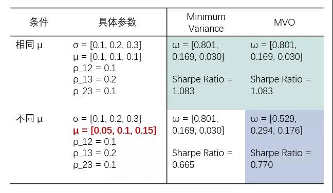将其和 ω_{mvo} 比较不难发现,当所有资产的收益率 μ 相等时,minimum variance 方法等价于 MVO。