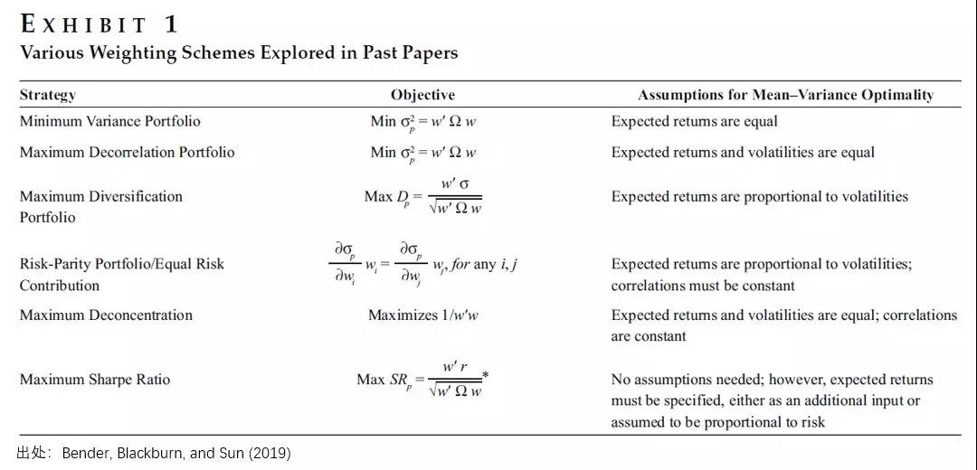 写今天这篇文章源于我最近看了 Bender, Blackburn, and Sun (2019)。该文比较了不同的配置方法在构建因子投资组合时的效果(包括一些本文没有涉及的方法,见下表)。