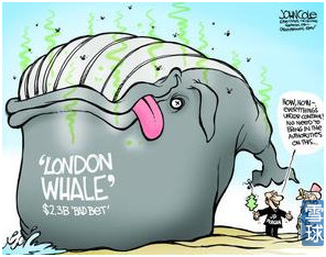 Skew高意味着者什么?意味着有套利机会,大大的套利机会。所以这时候对冲基金嗅着铜臭味来了。他们不知道是哪个散财童子犯下了这么低级的错误,于是对冲基金们反向操作,盼望市场的力量将Skew调节回正常的接近于零的状态,从而攫取其中的套利利润。对冲基金们苦苦等待,同时摩根大通继续毫不知情的抛售,直到JP Morgan突然发现自己的风险敞口模型一直都算错了。经过各种权衡妥协,摩根的老大吉米呆萌(Jamie Dimon)决定停止在错误的道路上越走越远(实在是亏不起了), 2012年4月市场的波动,摩根大通无可奈何,只能宣布伦敦鲸巨亏,在CDX市场上巨量的头寸给它带来了数十亿美元的亏损。