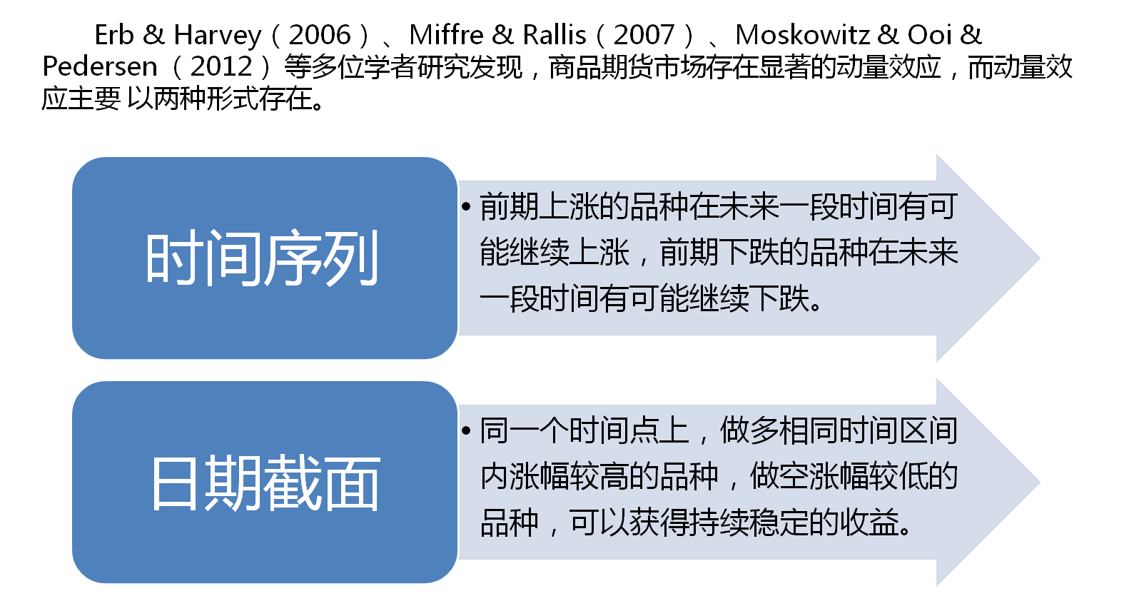 阅读更多资料我们可知:动量效应打破了有效市场假说,曾被认为是一种市场“异常”,但随后,越来越多的股票市场和其他类型的交易市场(如期货市场)都被证明存在动量效应。且动量因子作为 CTA 量化策略追踪趋势的主要因子之一。