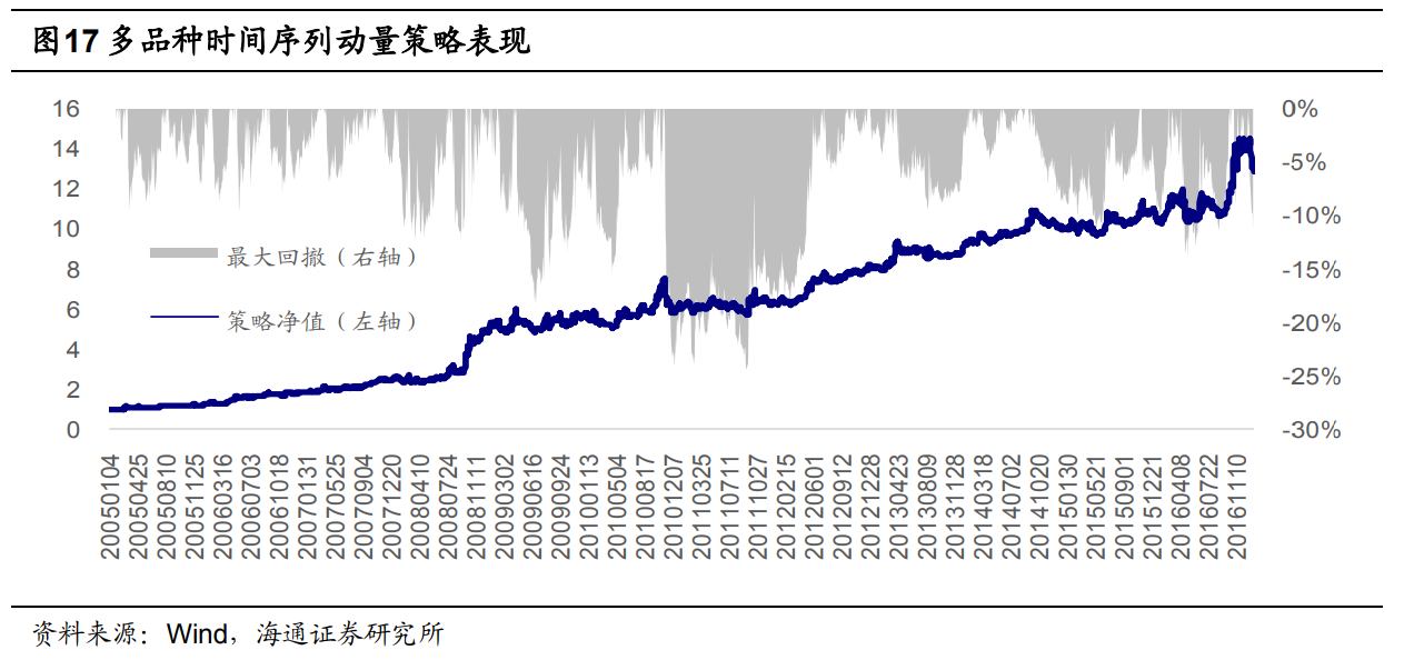根据海通证券研报,Moskowitz, Ooi 和 Pedersen(2012)使用 1985 年至 2009 年间 58 个商品期货品种的数据研究发现,商品期货具有明显的时间序列动量效应,做多前期上涨的品种,做空前期下跌的品种构建的多品种投资组合可以取得持续稳定的超额收益。我们使用我国商品期货品种来验证该策略的有效性。