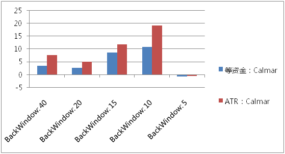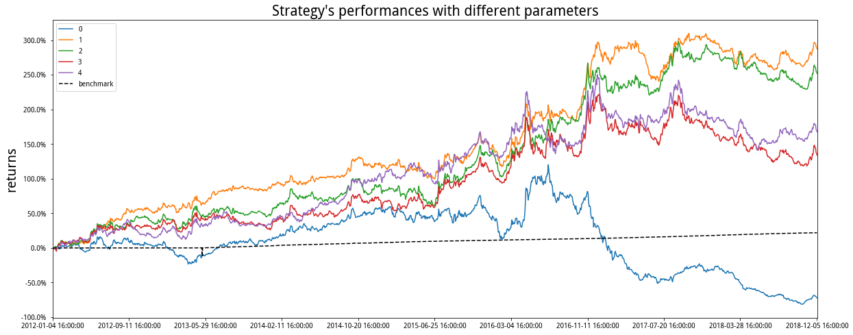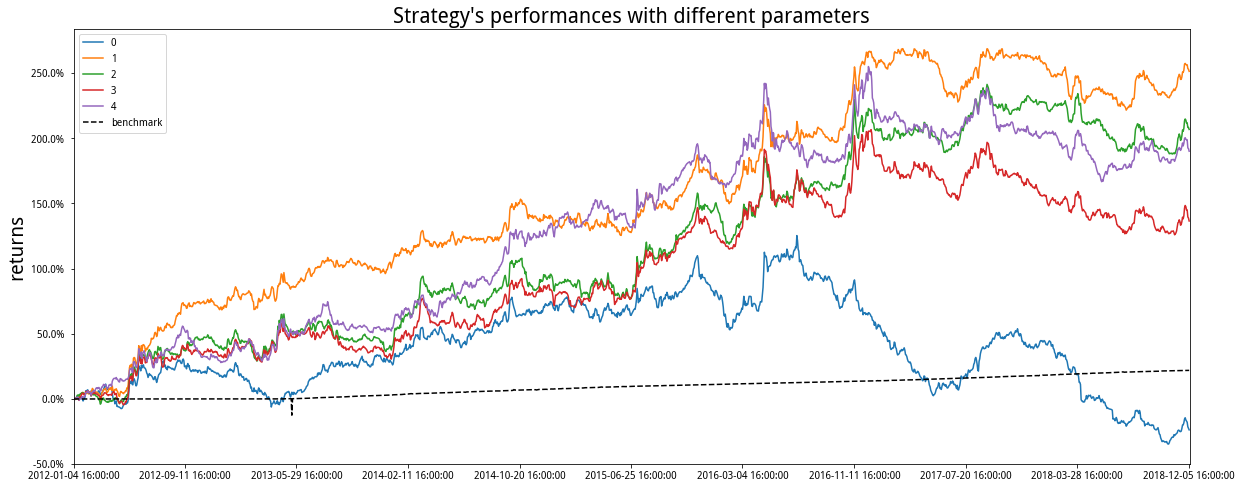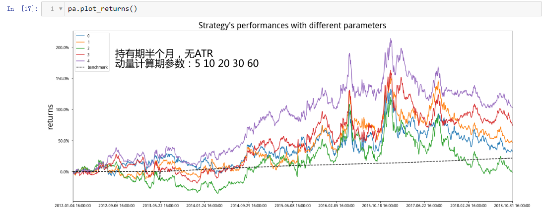 上图为等资金仓位,5日调仓的效果。然后我们注释掉等资金模块,打开ATR倒数头寸模块,得到多组测试绩效如下: