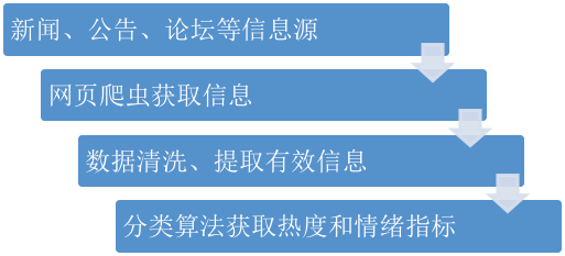 然而,直接获得的文本数据是非结构化数据,无法直接构建交易策略。构建文本挖掘策略的一个重要过程是对于文本的处理和分类。首先,要对获取的文本信息进行清洗,提取有效信息;然后,对文本信息进行分类。文本挖掘策略需要提取的信息类型大致可以分为两类:热度和情绪。涉及的主要分类算法包括:贝叶斯分类器,字眼统计分类器,向量距离分类器,判别分类器,文本情绪打分等。主要逻辑流程如图1: