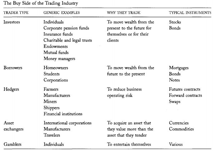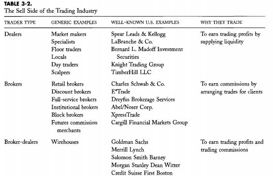 相反,经纪人代表客户进行交易。经纪商希望通过找到其他交易对象来和他们的客户进行交易。当成功撮合交易双方时,经纪人通过佣金盈利。我们在第7章讨论经纪人。许多卖方公司雇佣做市交易员和经纪人进行交易。这些公司因此被称为经纪商或双贸易商。卖方的存在只是因为买方会支付其服务费用。我们必须明白了解买方,因此理解卖方盈利的源头。在随后的章节中我们将讨论买卖双方如何以及为什么交易。表3-2提供了卖方构成。