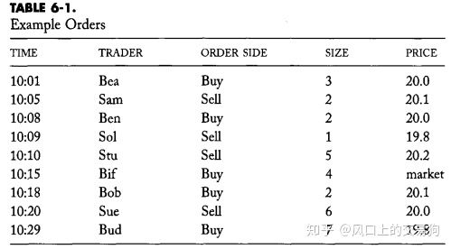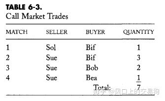 假设交易者把上述订单发送至了一个AUCTION市场,这个市场使用的是纯价格-时间优先规则,排列如上图,Sol的卖单在卖方报价优先,因为它提供了最低价格。 Bif的买单在买方方面的优先级最高,因为这是一个市场订单。 Bea的订单和Ben的订单的价格相同,但是,Bea的订单比Ben的订单有时间优先,因次它到了第一。