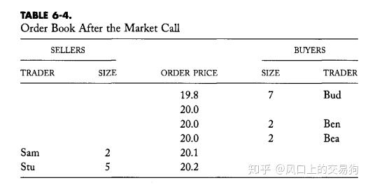 买单和卖单现在已经分开列明,如果现在市场开始持续竞价,市场报价就为:20 买入/4 单位,20.1 卖出/2单位。